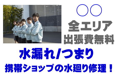 ○○で携帯ショップの水廻り修理をPROのスタッフが対応。グリストラップのつまり、排水溝清掃、シンクのつまり、蛇口の水漏れ、高圧洗浄などはお任せください。
